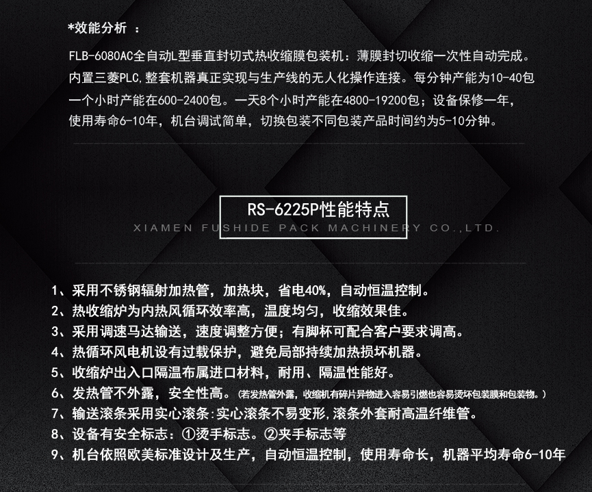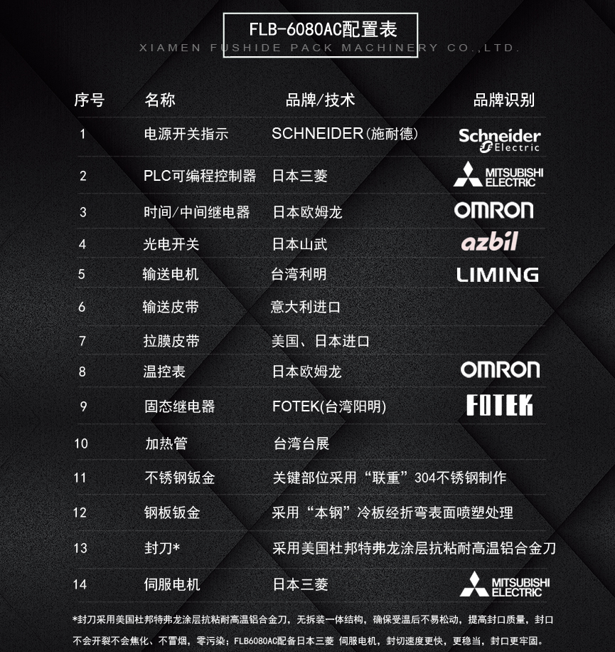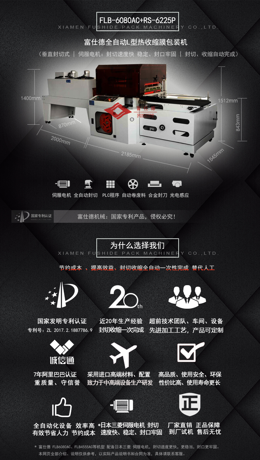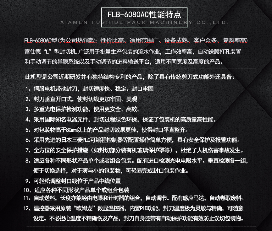 富仕德FLB-6080AC(暢銷款):采用智能化、標(biāo)準(zhǔn)化、通用化的結(jié)構(gòu)設(shè)計(jì),使得本機(jī)長期運(yùn)行穩(wěn)定、可靠,變換產(chǎn)品規(guī)格方便輕松。采用國際知名電器元件零部件,封切過程綠色環(huán)保,保證了包裝機(jī)的高質(zhì)量高性能。伺服電機(jī)帶動(dòng)封刀,封切速度快、穩(wěn)定、封口牢固